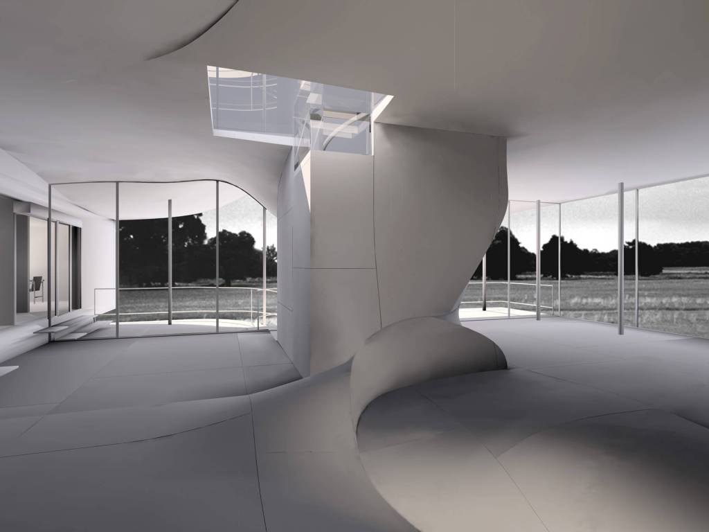 In Torus House, designed for a landscape painter, Cohen further explores the connection between architecture and its natural surroundings. The building’s design leverages curvilinear forms that engage with traditional orthogonal elements—floor, walls, and ceiling—creating a seamless connection with the rolling landscape of Old Chatham, New York. The toroidal shape, reminiscent of a doughnut, enhances the spatial fluidity and visual continuity of the interior with the exterior environment.